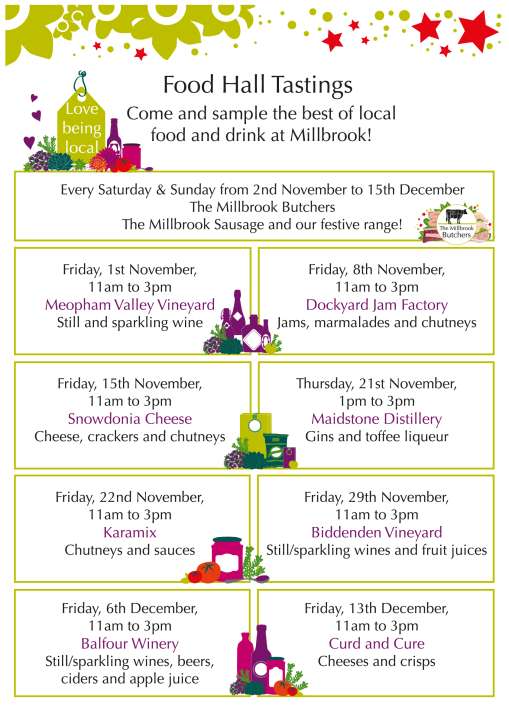 From 2nd November-15th December we’re inviting customers to enjoy free tastings at our Gravesend Food Hall. Sample delights from some of our favourite local producers then pick up a few early gifts for the foodies in your life. Love local at Millbrook this Christmas!
